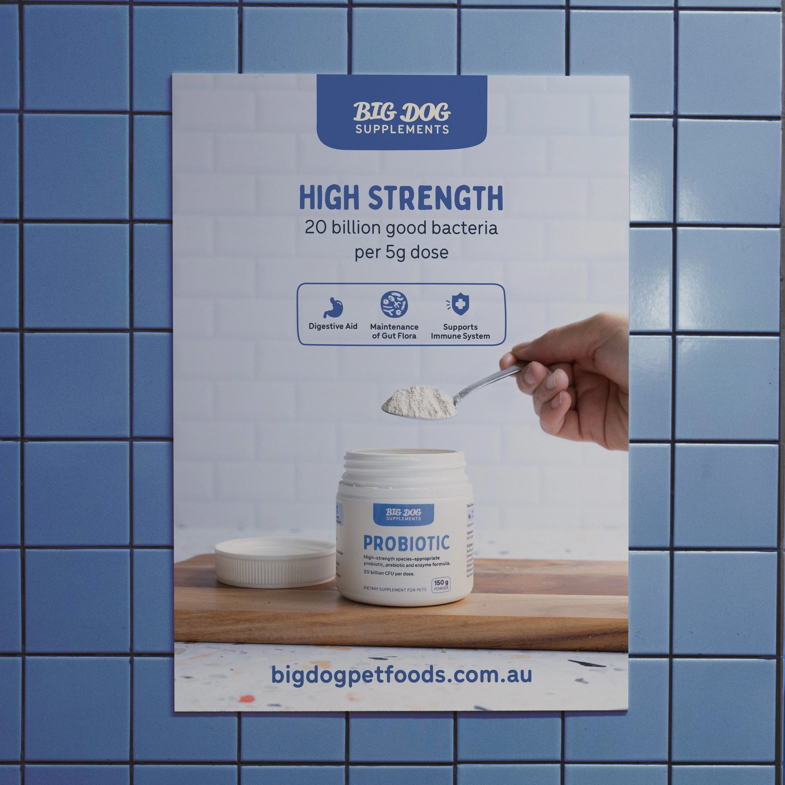 This project took on more than just a label design. It was a complete reposition and rebrand for Big Dog Supplements, the gut health products that complemented Big Dog Pet Foods’ raw pet food. Starting with the first Probiotic label and point of sale the relaunch of this product saw a massive uplift in sales in the first 12 months (411%). I worked alongside fellow graphic designer, Jessica Zoet to produce the photography for the launch campaign (hand modelling & styling). This product's success has helped develop the range of gut health supplements to be launched towards the end of 2023.